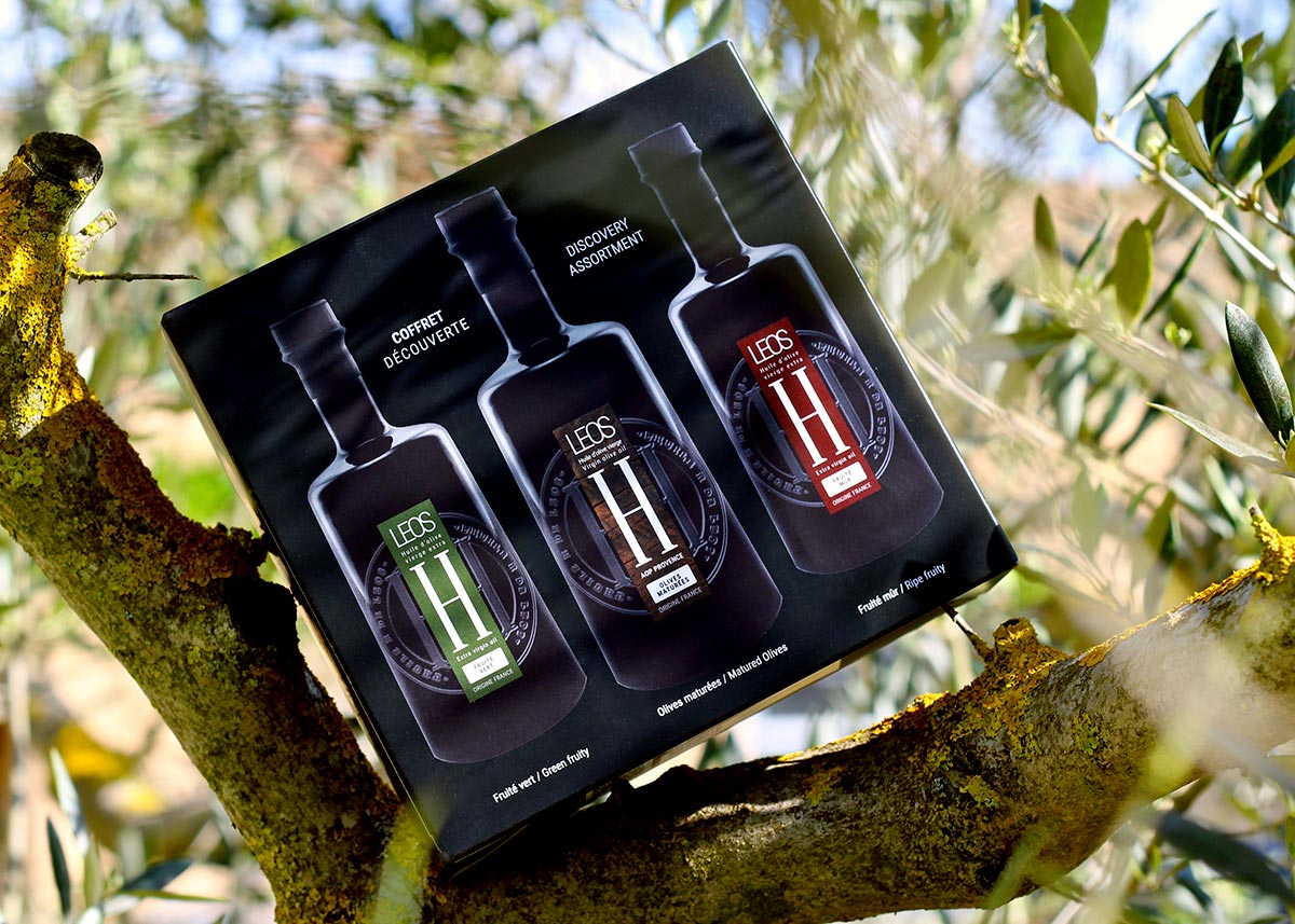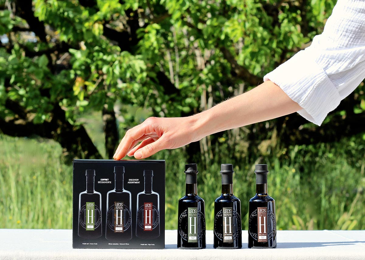 Propriétaires d’épiceries de luxe ou tout simplement particuliers fans des huiles d’olive H DE LEOS, vous êtes nombreux à nous avoir demandé de créer un format spécial pour faire des cadeaux en regroupant plusieurs bouteilles. Nous l’avons fait avec la création de ce joli coffret-cadeau de 3 élégantes bouteilles de 100 ml qui permettra à tous les amateurs d’huiles d’olives d’exception en maturée, fruité vert et fruité mûr de découvrir toute la puissance et la subtilité aromatique de ces deux huiles H De LEOS. Ardentes et douces, elles peuvent ainsi être utilisées pour toutes les cuisines, des entrées aux desserts !