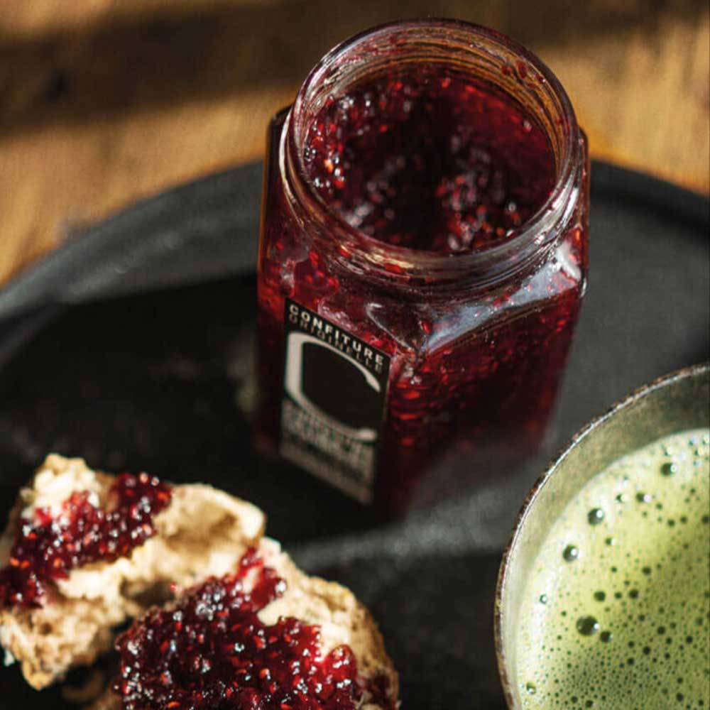 Une confiture artisanale, cuite au chaudron, fabriquée à partir d’une sélection de framboises et du thym sauvage du domaine de LEOS